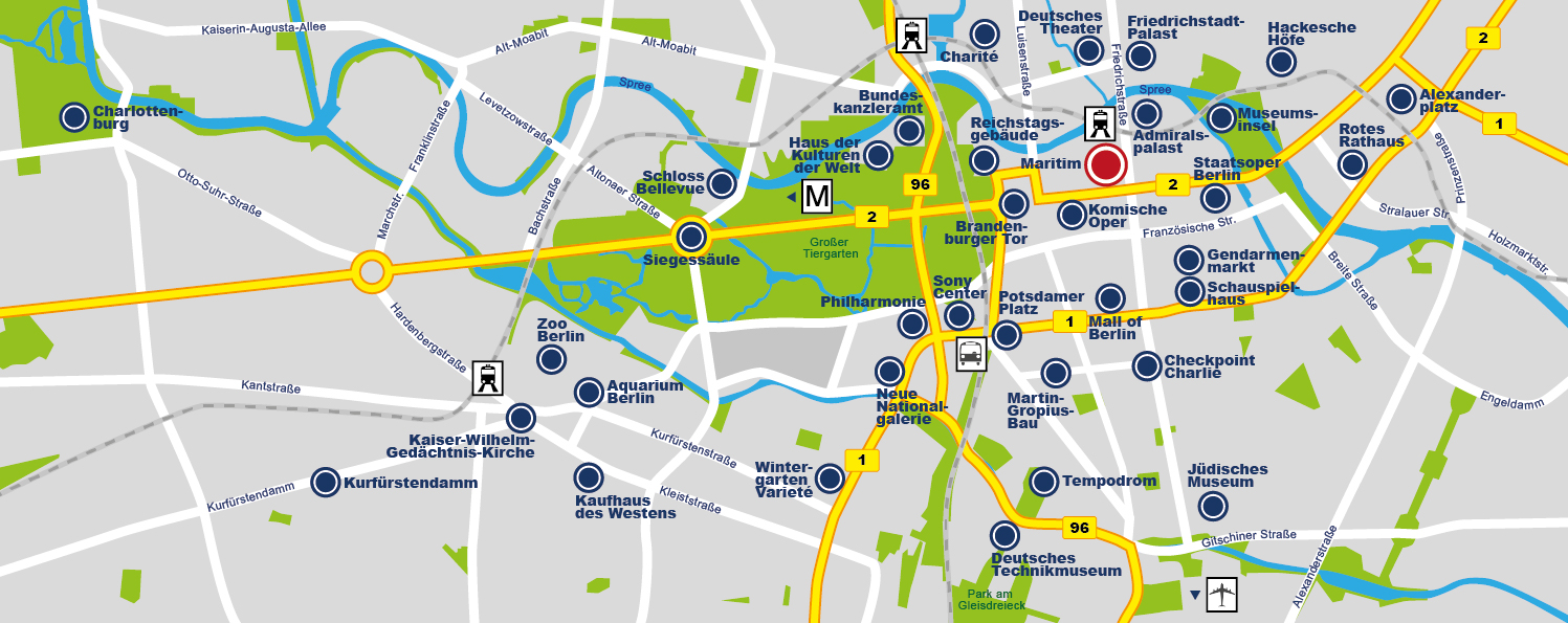 The Maritim proArte Hotel is centrally situated between the Brandenburg Gate and the Gendarmenmarkt directly on the Friedrichstrasse. The main entrance and the entrance to the underground car park are located on Dorotheenstrasse. From here, you can reach many of the city's attractions by foot: the Friedrichstadt-Palast Theatre, Museum Island, the Reichstag building, the "Unter den Linden" shopping street, various theatres and lots more.