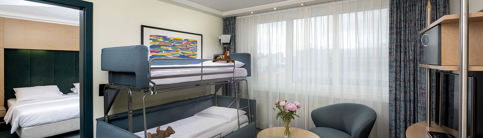 Family suite with bunk bed, sofa, table and view into bedroom at Maritim proArte Hotel Berlin