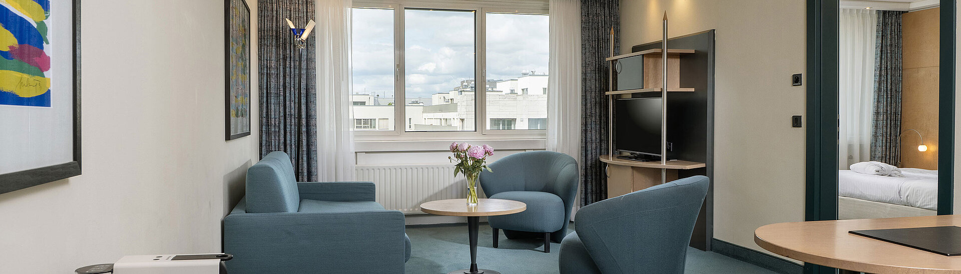 Seating area with sunset view in the Kuckei Suite at Maritim proArte Hotel Berlin.Junior suite at Maritim proArte Hotel Berlin with living area, desk, sofa, and separate bedroom with king-size bed. Junior suite at Maritim proArte Hotel Berlin with seating area, city view, and elegant design elements.